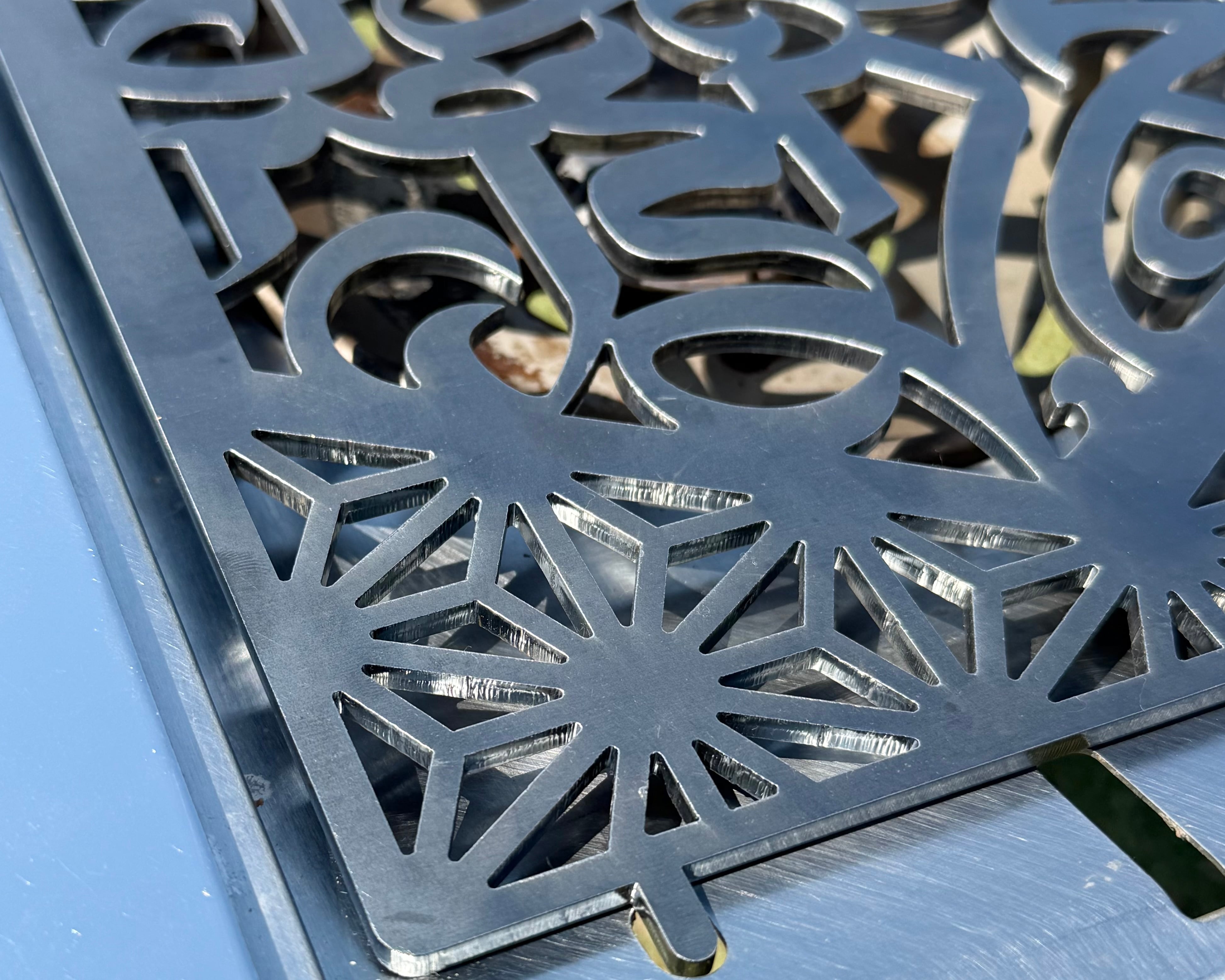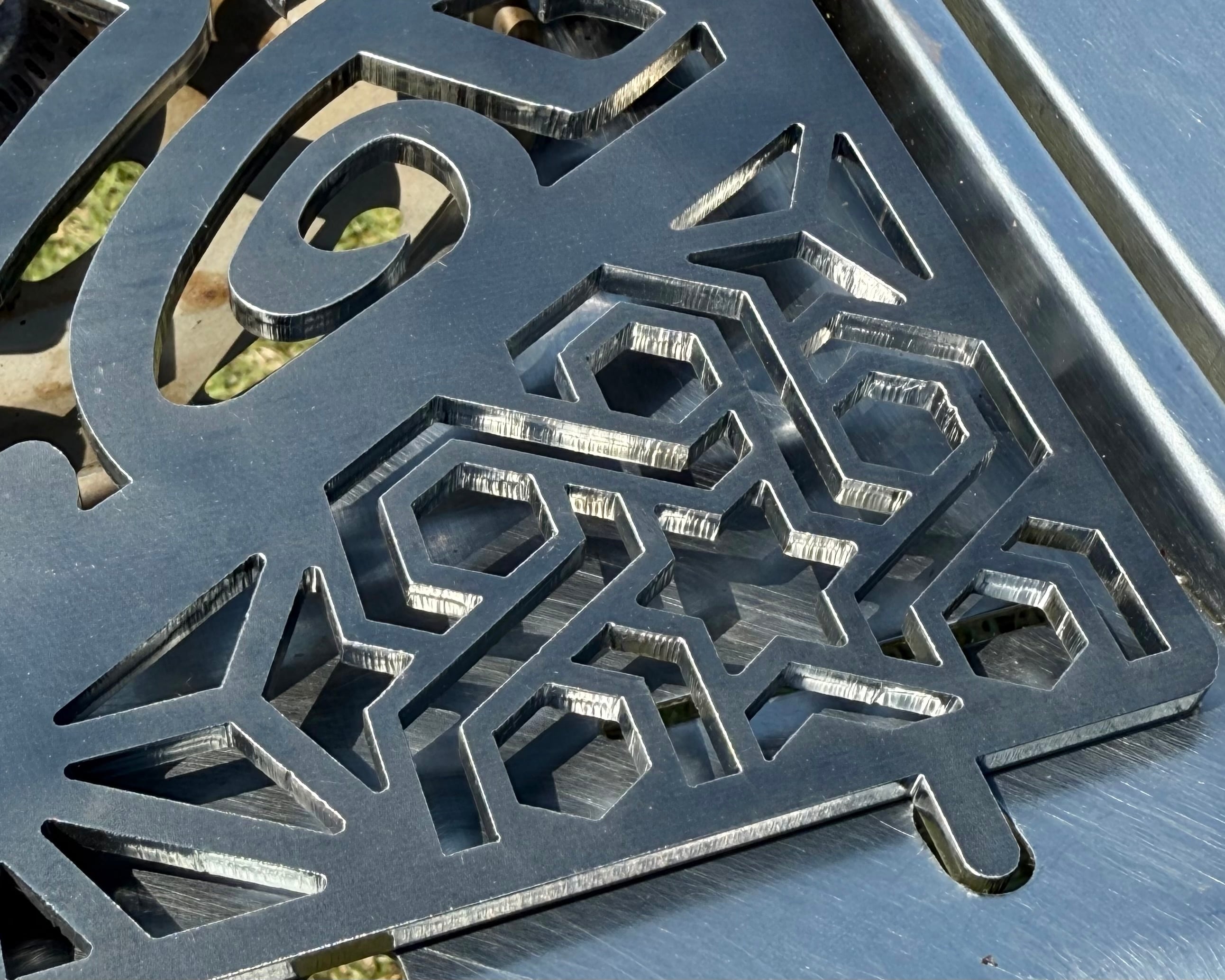 その周囲には、日本の伝統文様である麻の葉模様とフジノハガネさんのシンボルである六花模様を精密なレーザー加工で美しく仕上げていただきました。