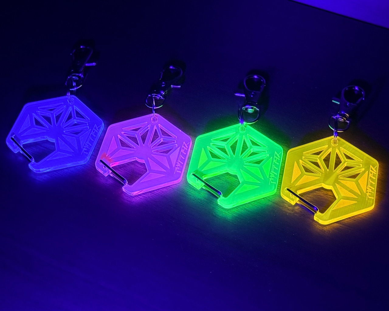 集光アクリルは、紫外線を浴びると蛍光色に発光する特殊素材で、ブラックライトを当てると画像のように鮮やかに光ります。