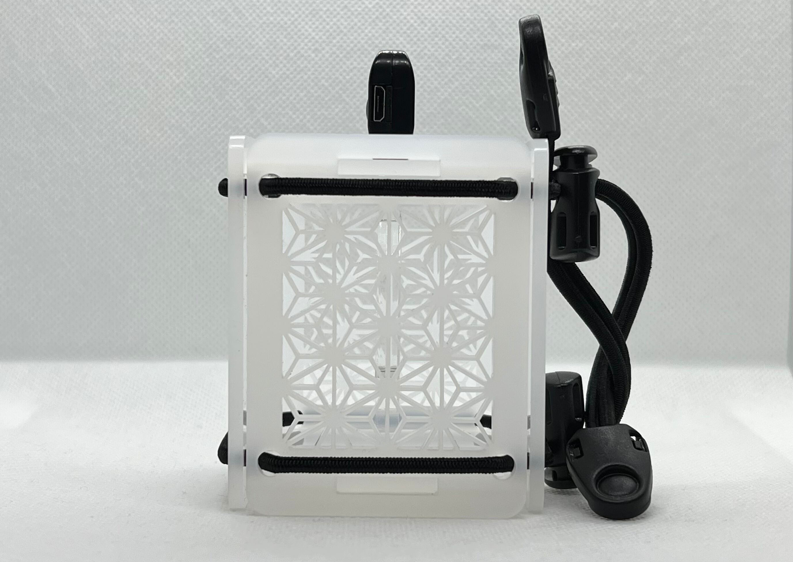 アクリルで作成した麻柄模様を細かく再現した灯籠風のシェードになります。表面は光沢を適度に抑えたマット調のホワイトで指紋がつきにくい国産アクリルを使用しております。