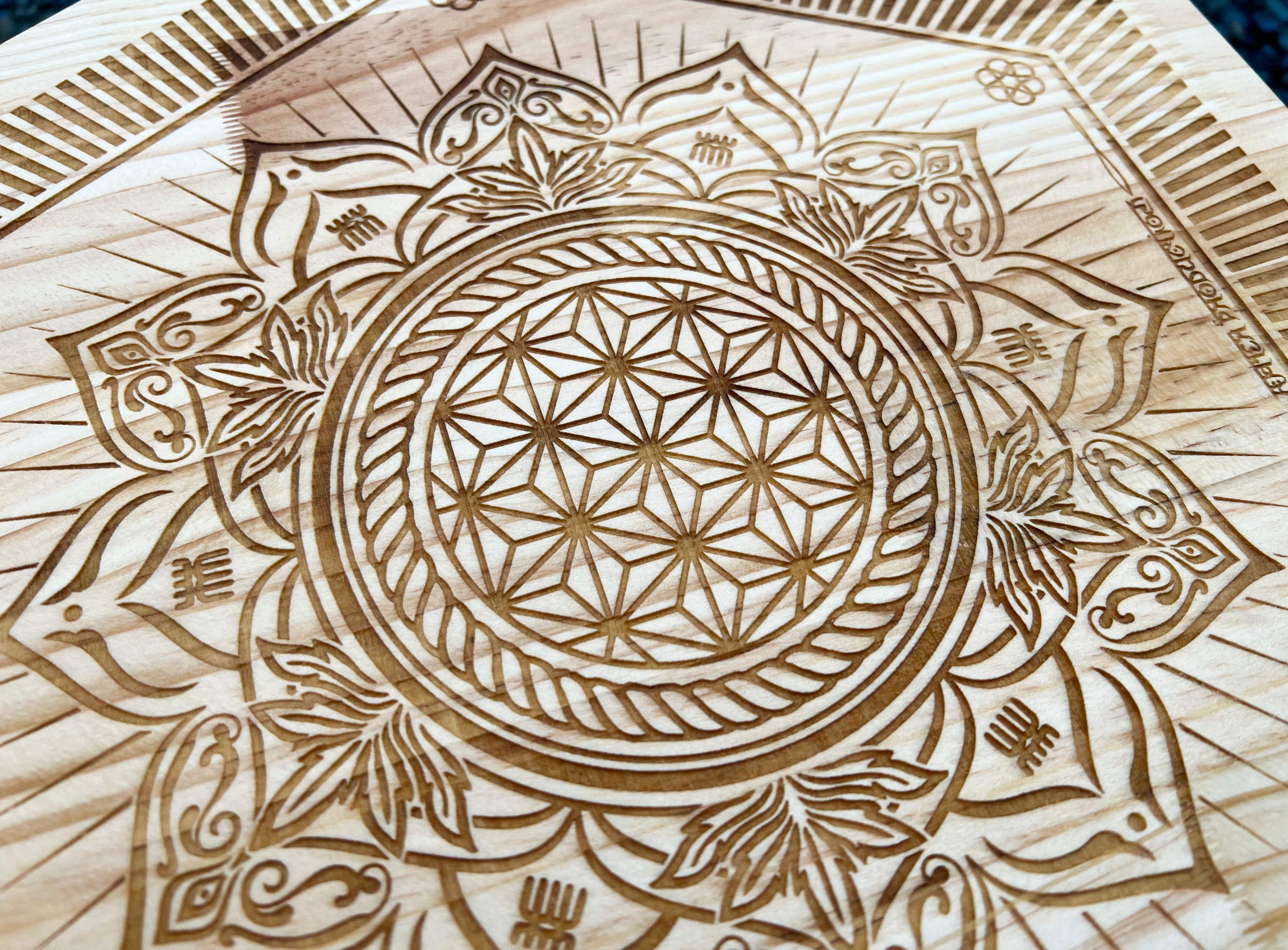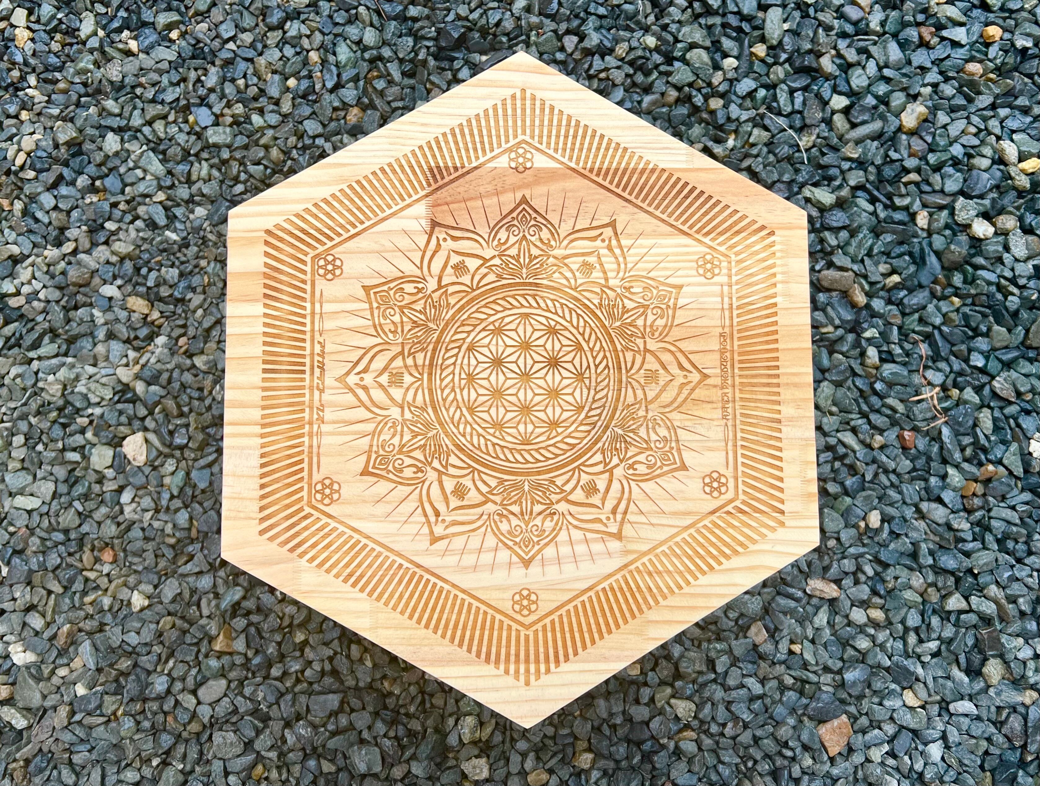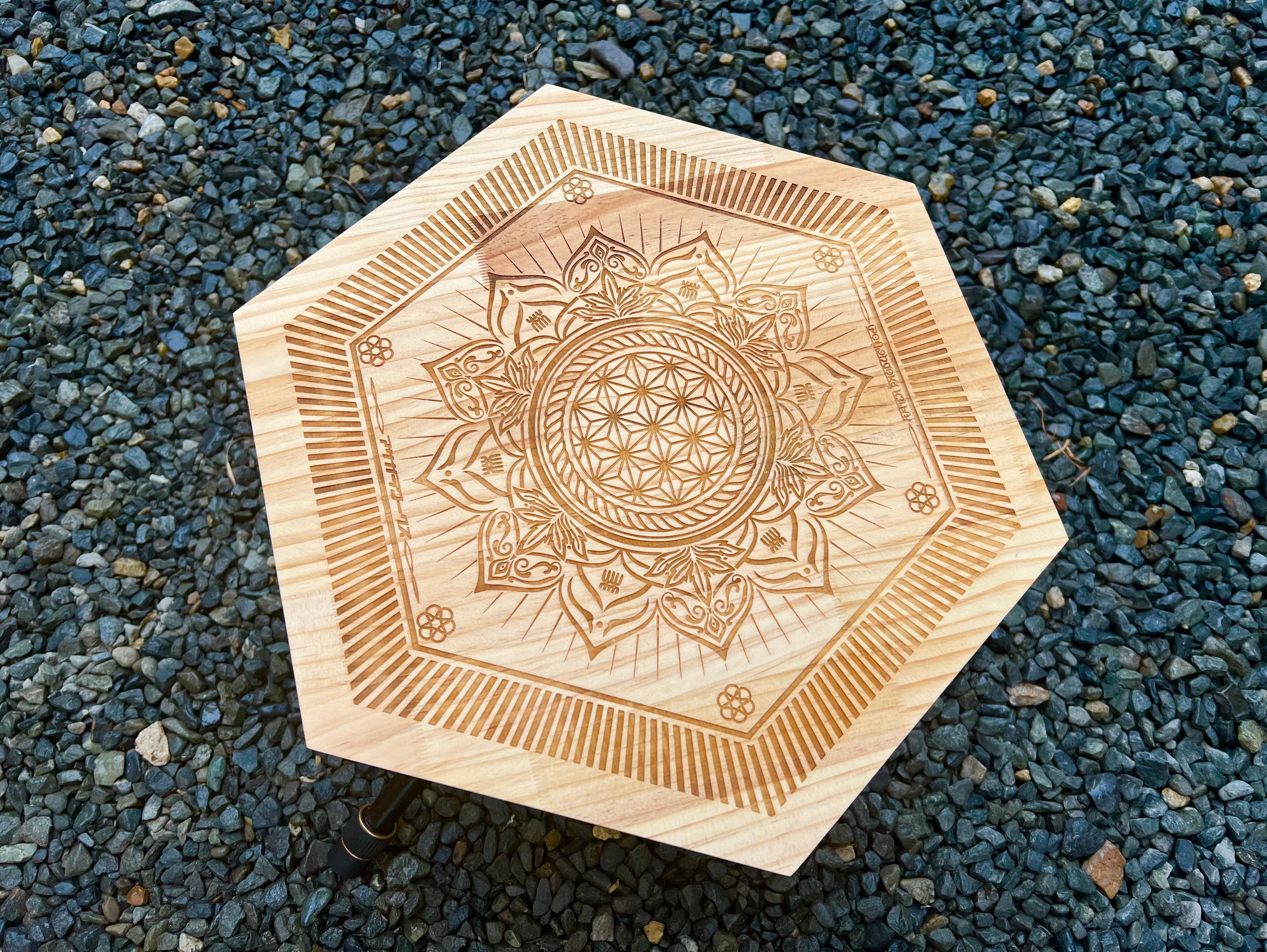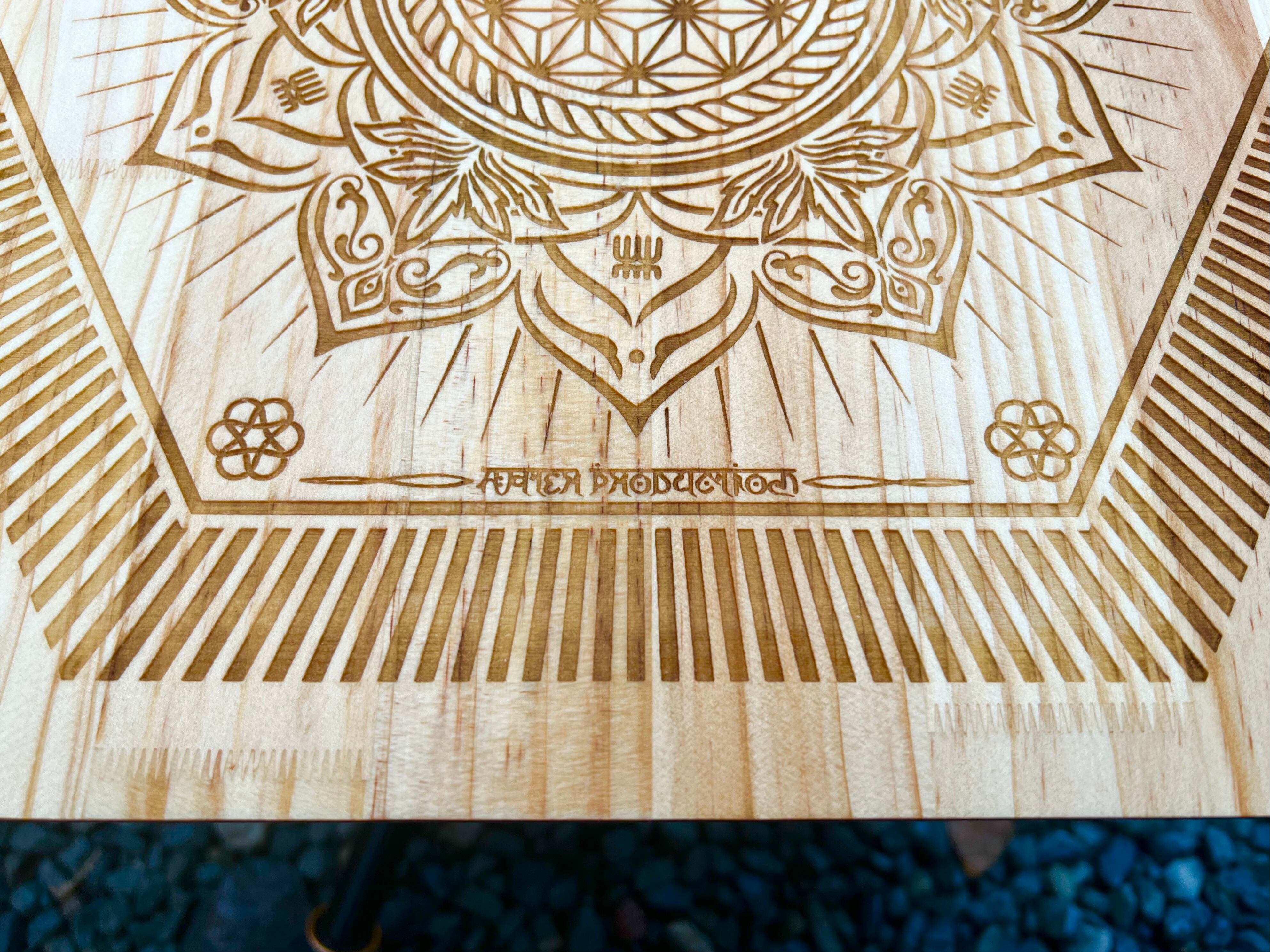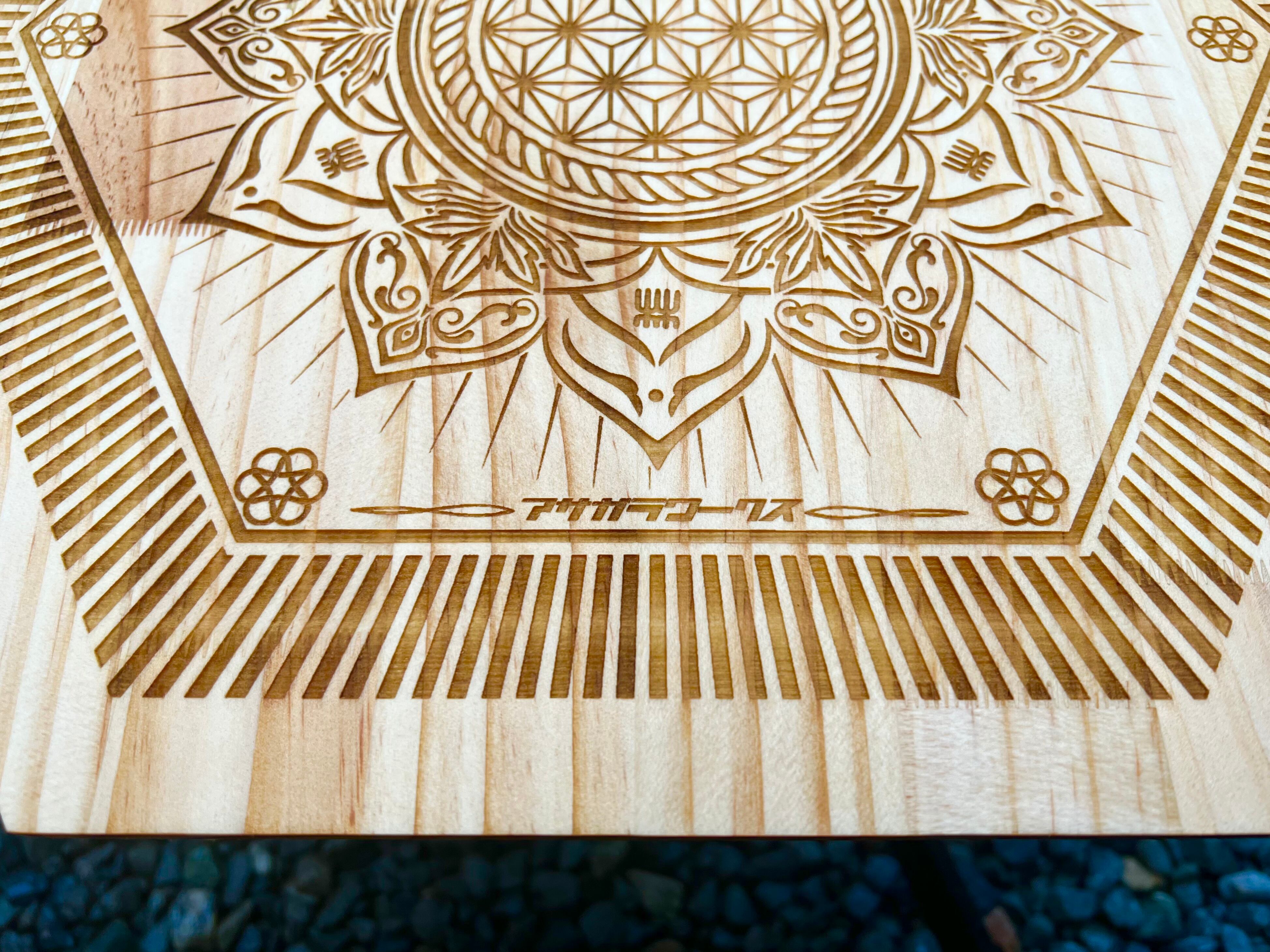 @haterproduction氏による麻柄と曼荼羅模様の融合デザインを彫刻した"吉祥日輪"天板になります。