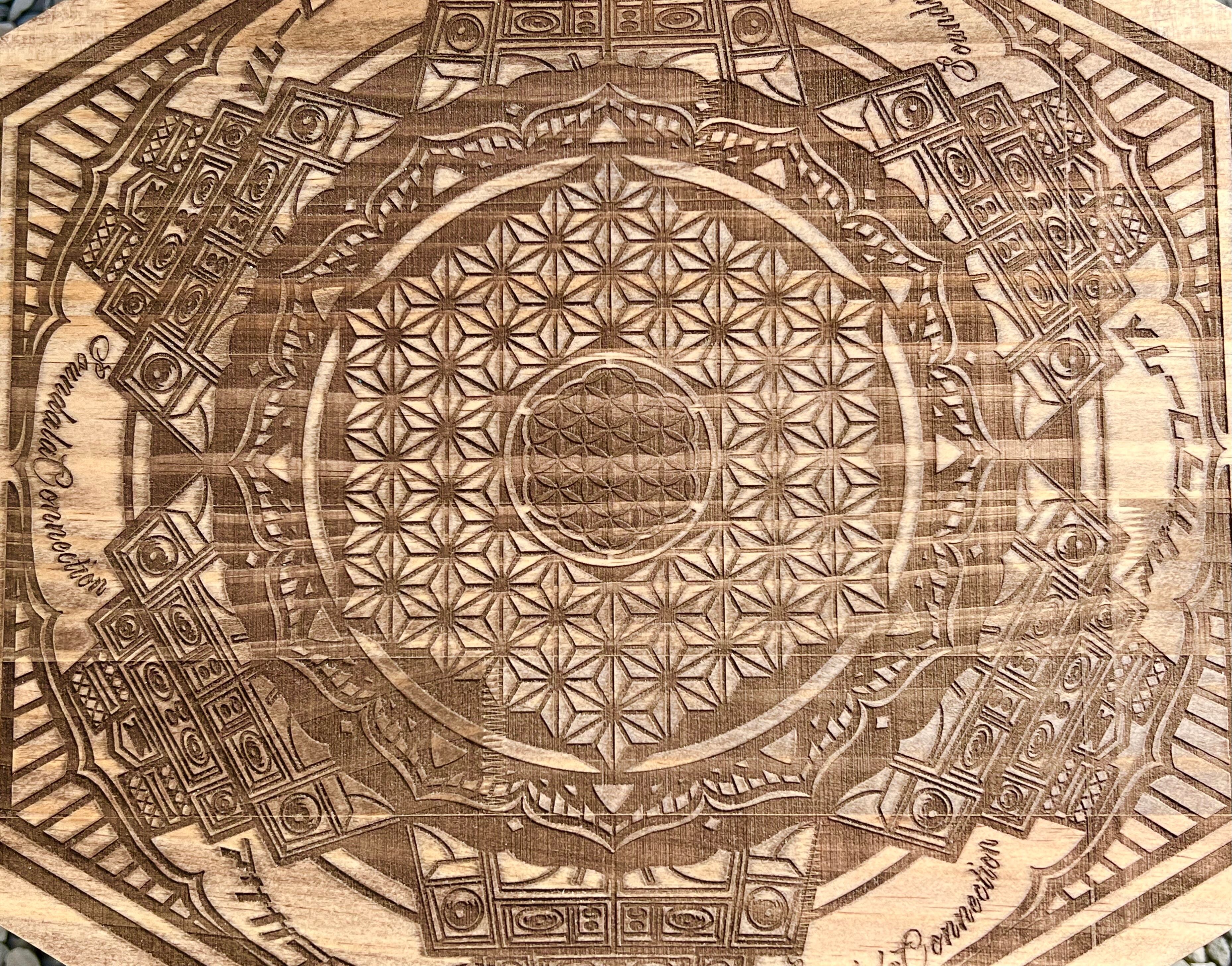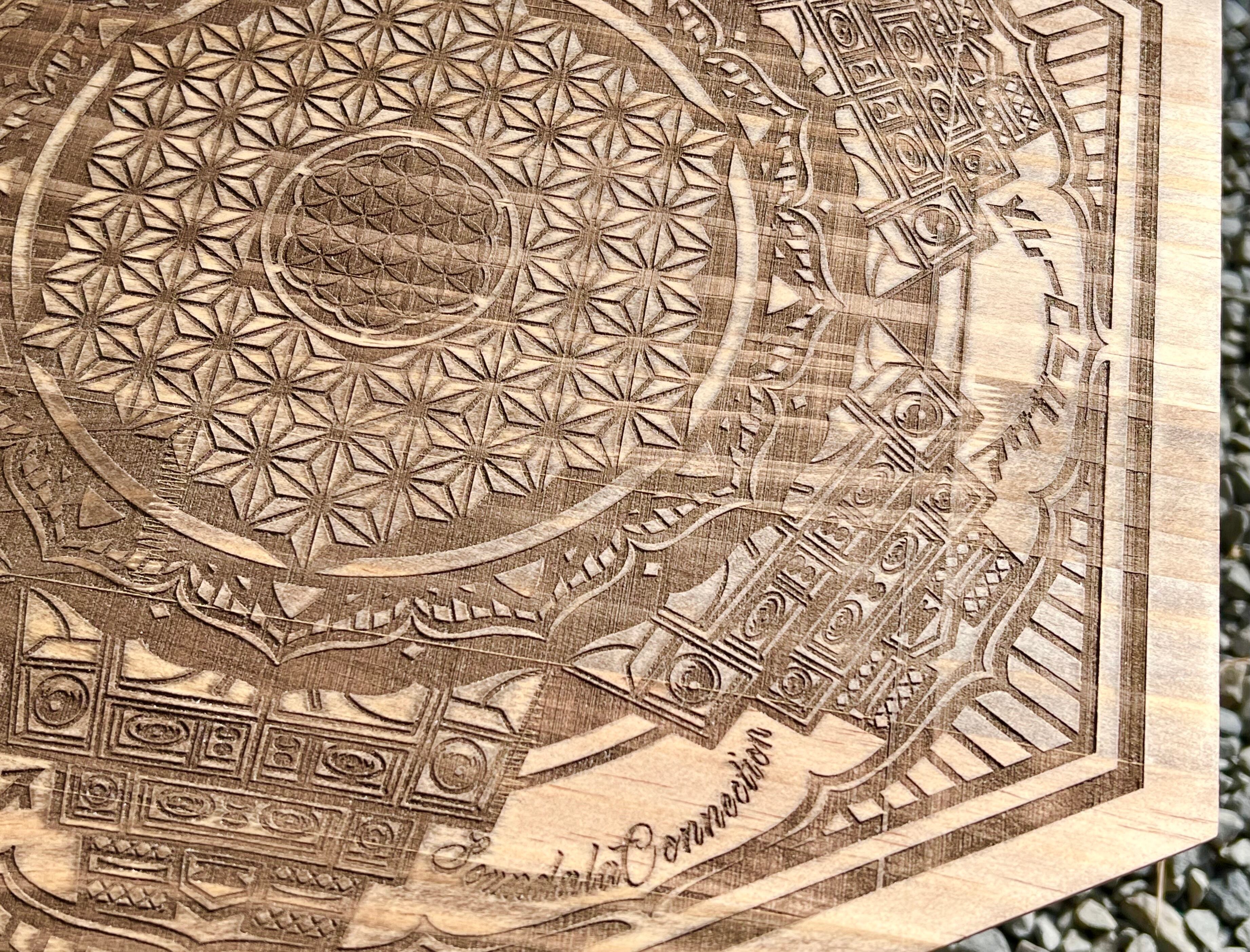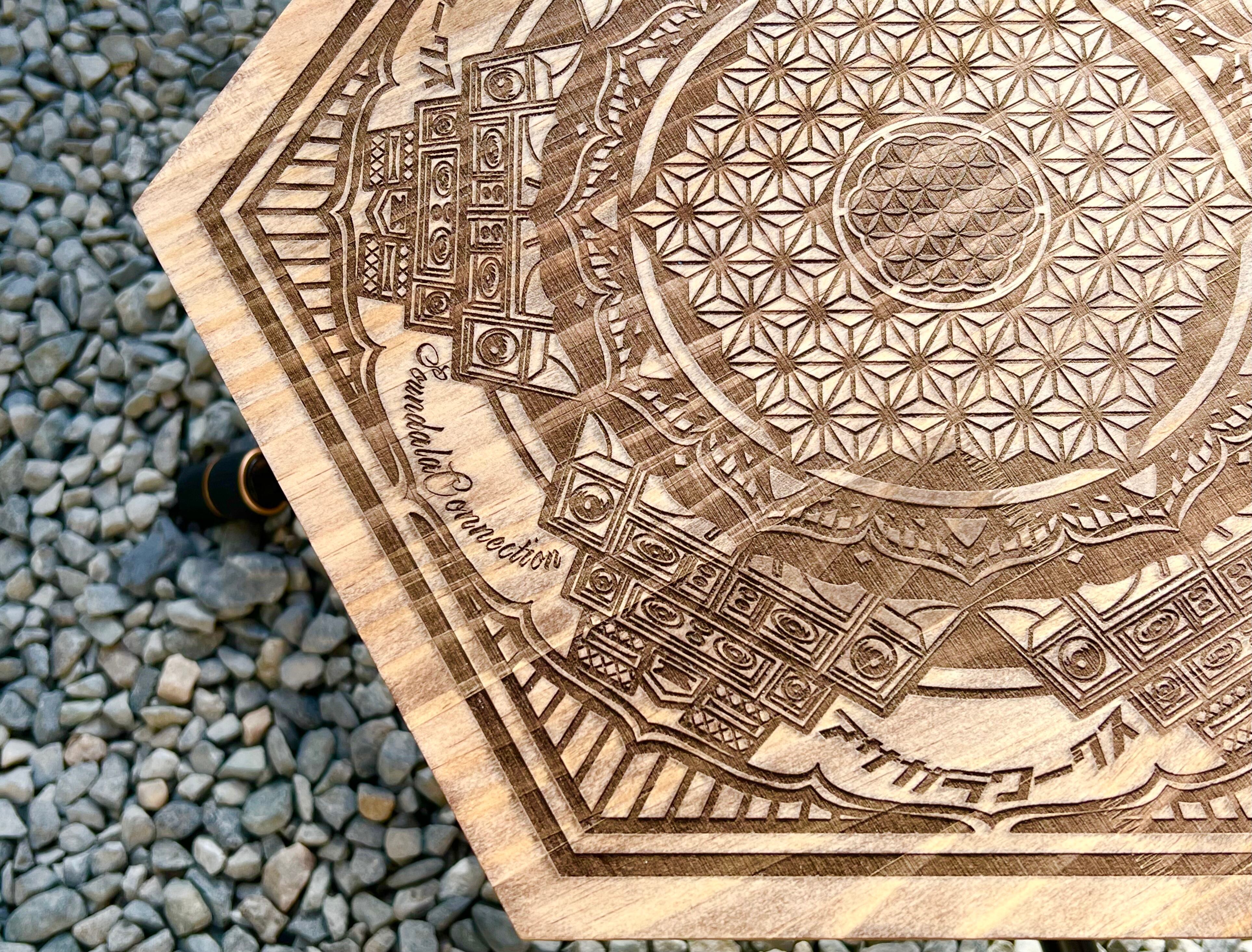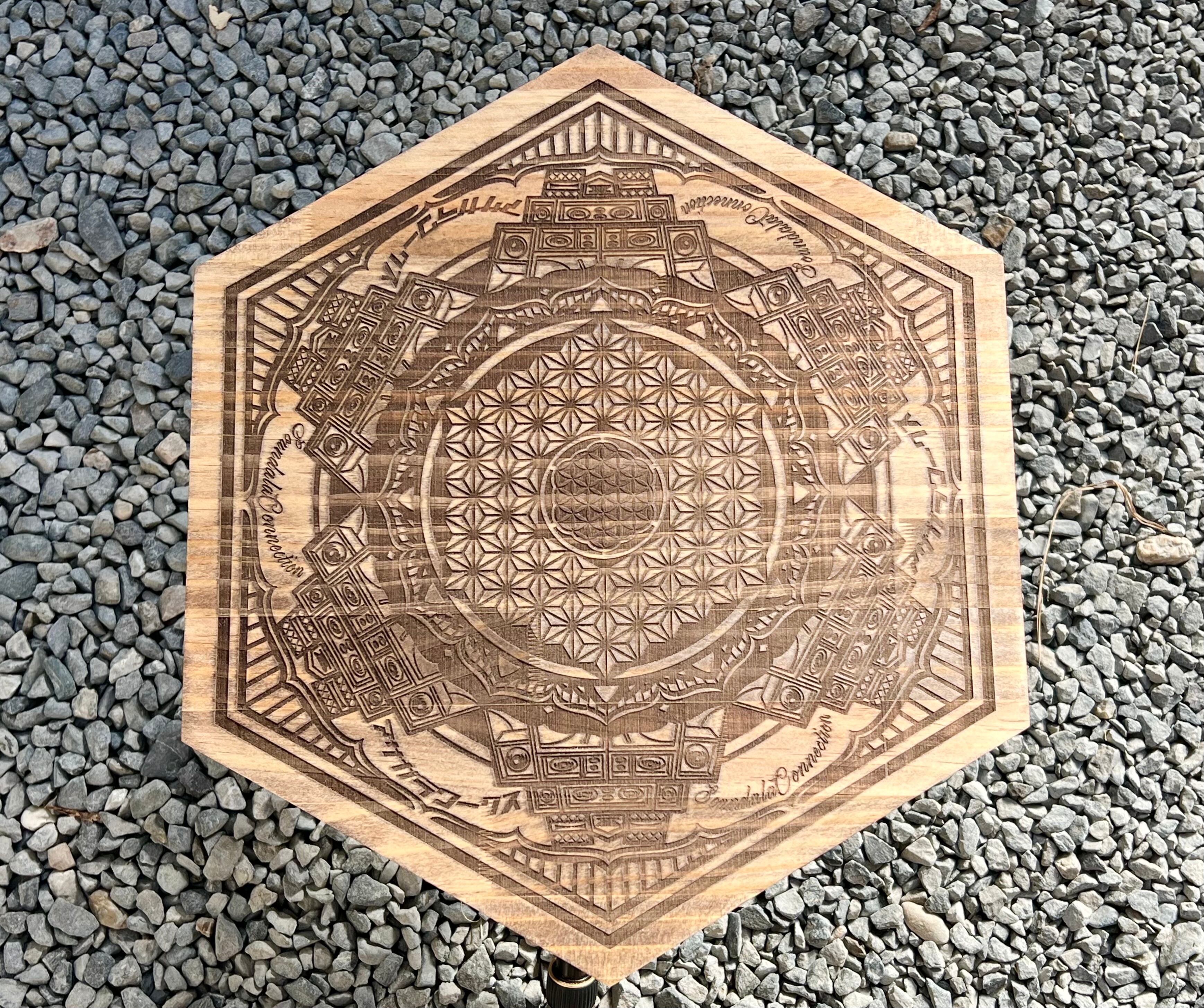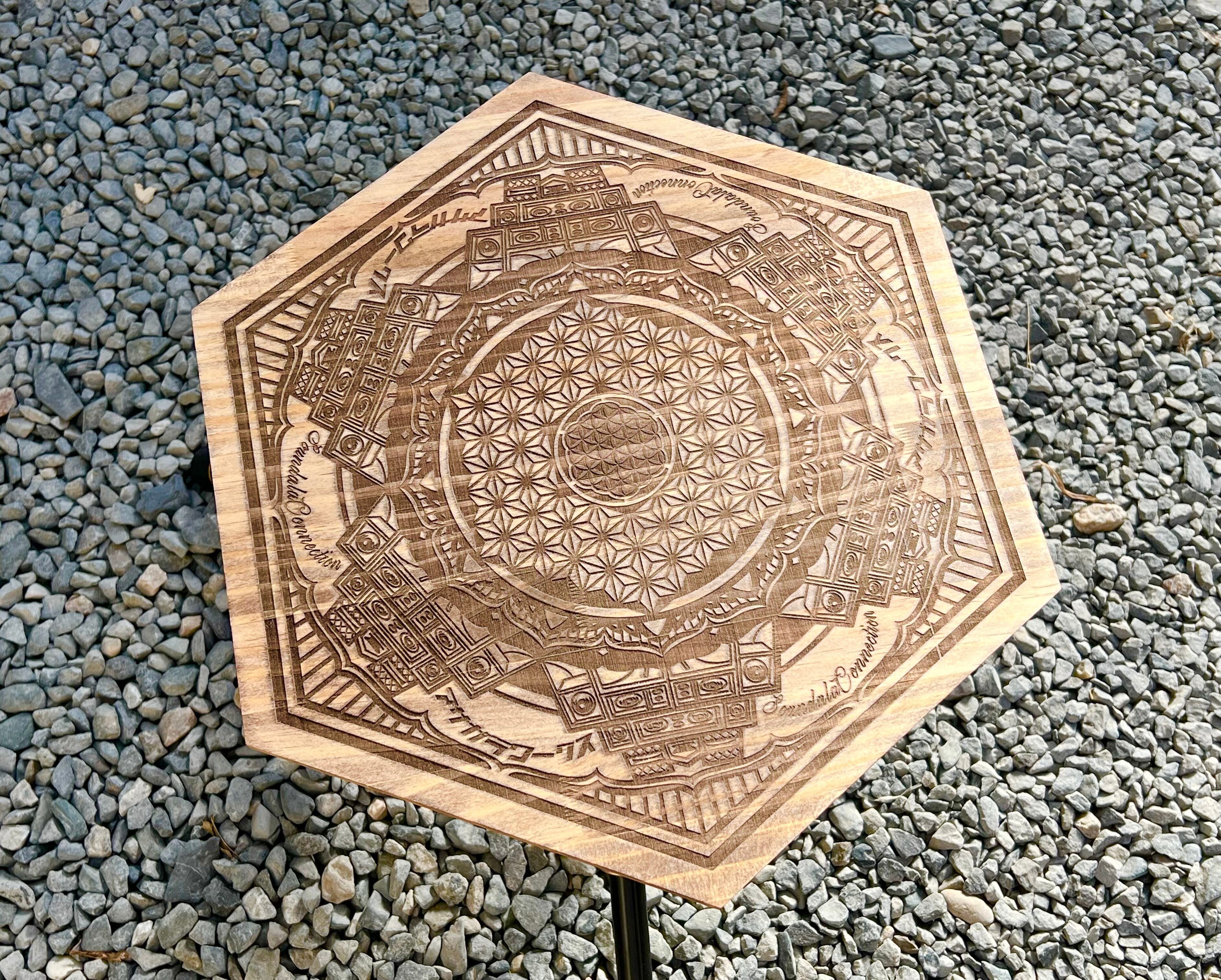 サウンドシステムと曼荼羅模様の融合イラストを手掛ける@art-c-soundalaa sound氏のオリジナルデザイン、"a sound"をレーザー加工機で彫刻した三脚用天板になります。