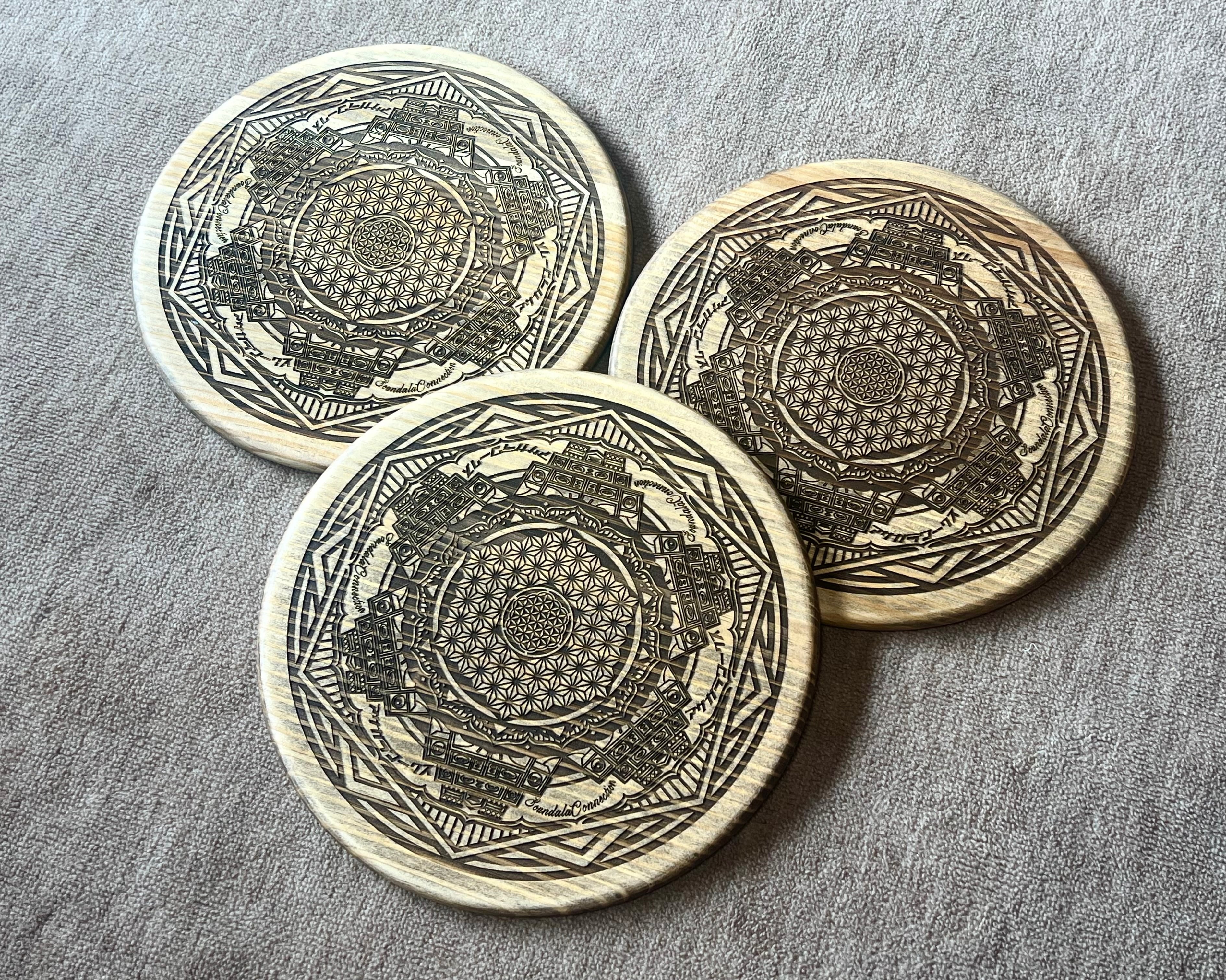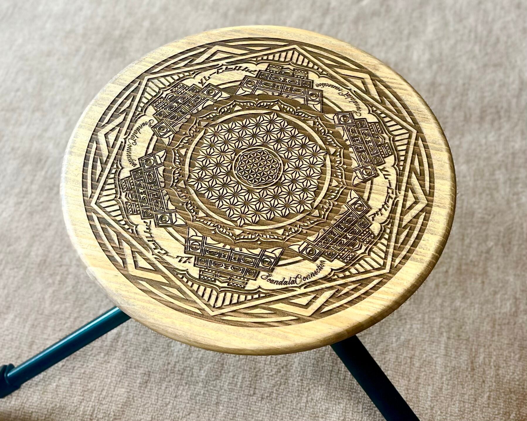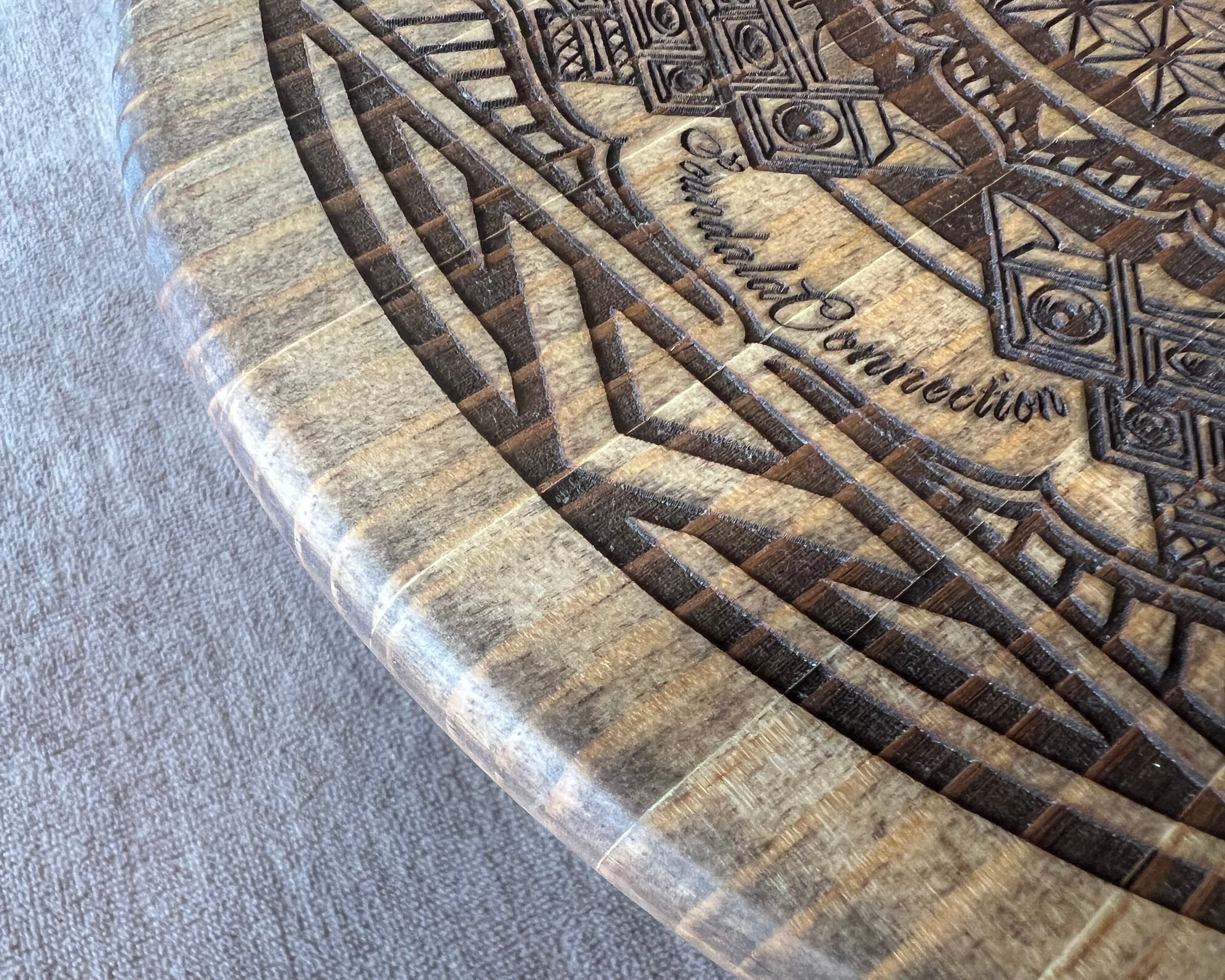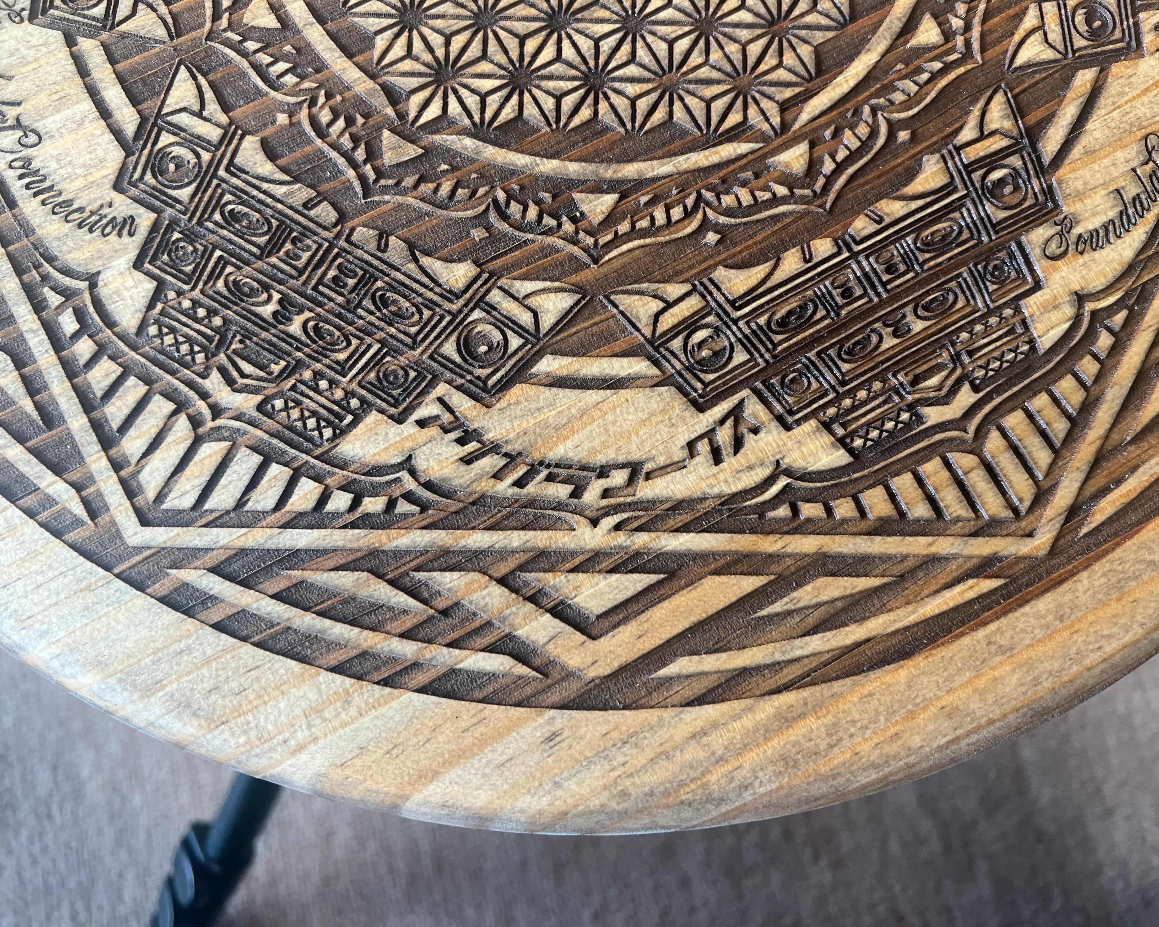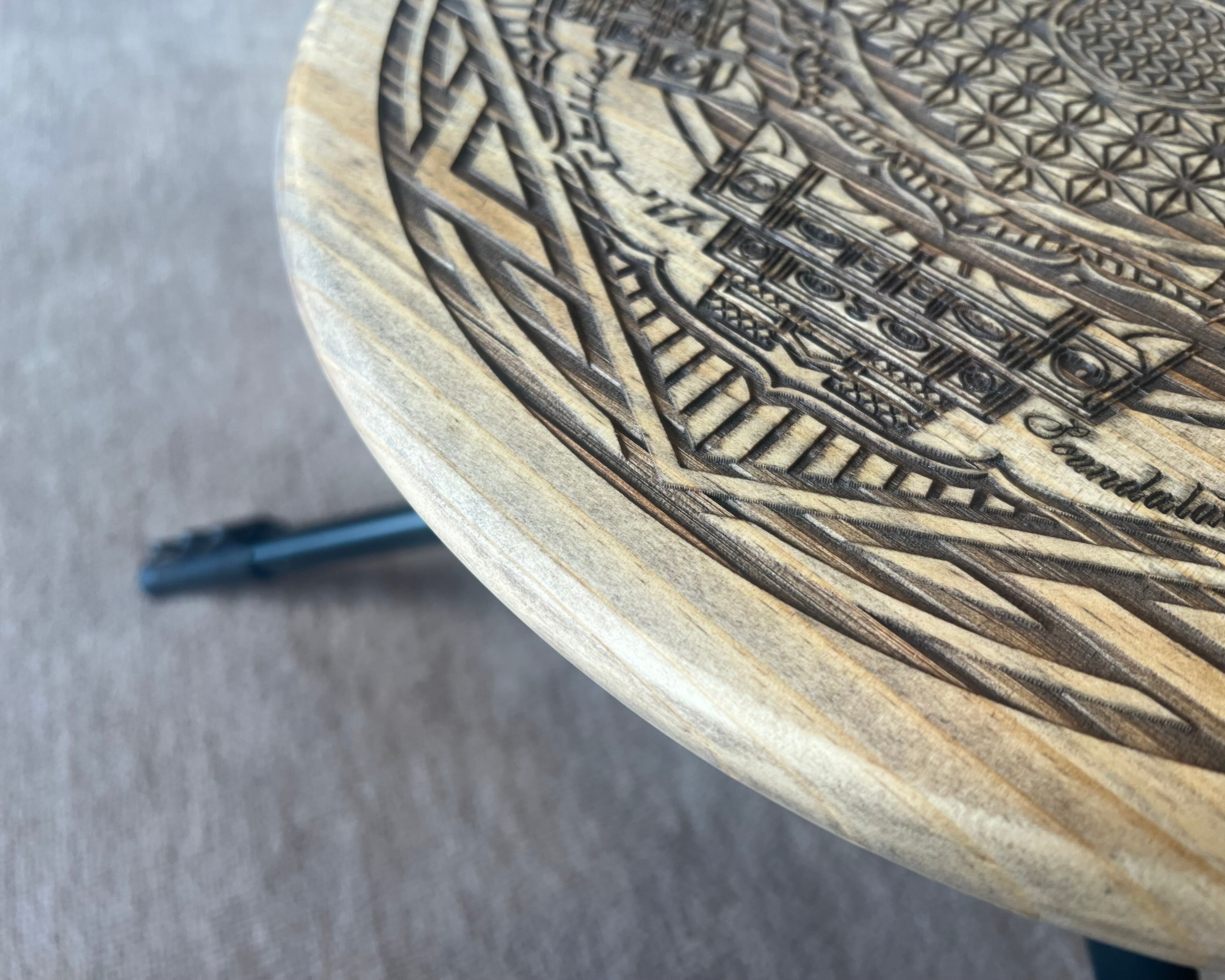 ・カメラ用の三脚に使用できるサイドテーブル用の天板になります。パイン集成材にオリジナルデザインを彫刻し、他には無い唯一無二のサイドテーブルになります。