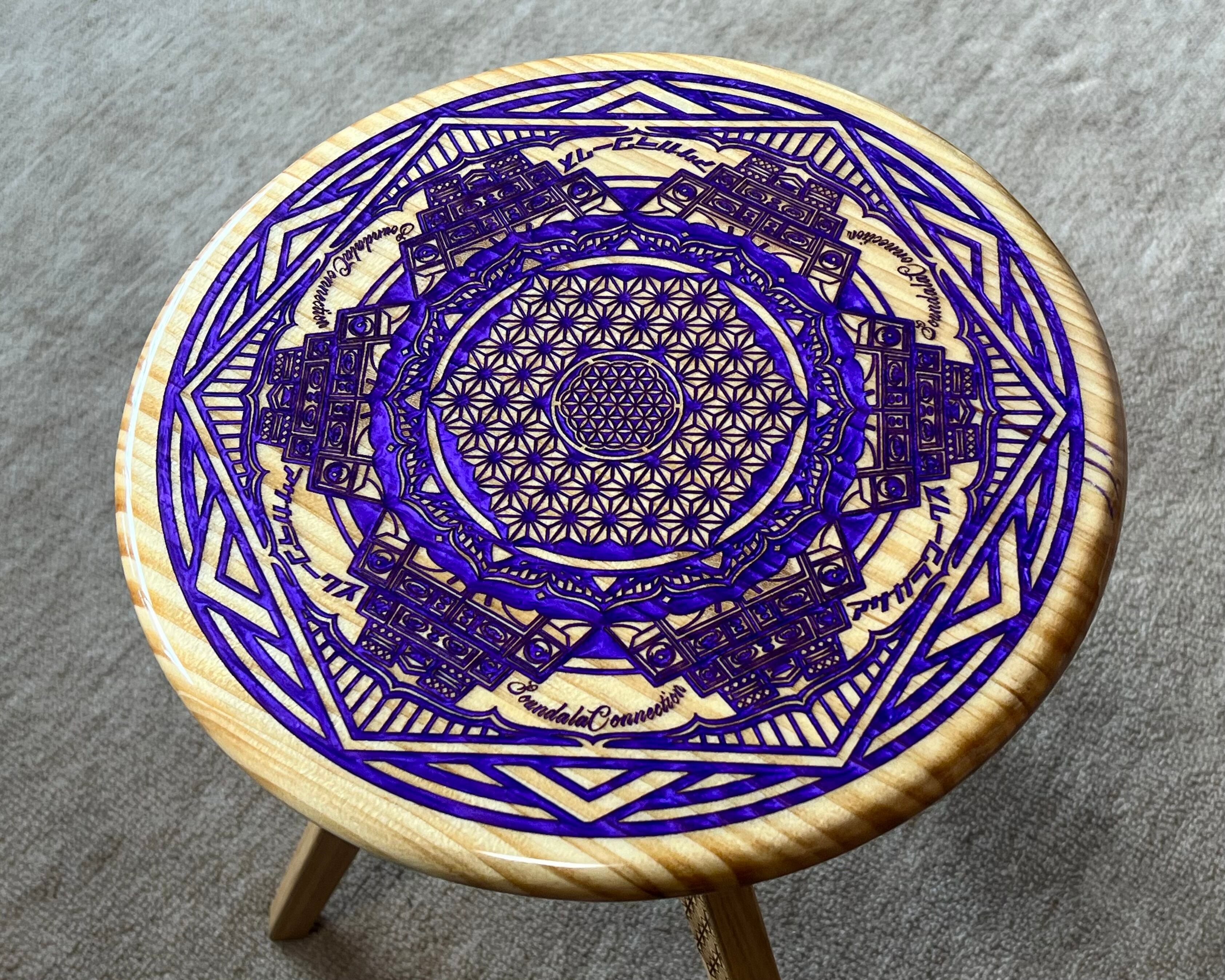・カメラ用の三脚に使用できるサイドテーブル用の天板になります。パイン集成材にオリジナルデザインを彫刻し、その彫刻箇所にレジンを流し込み、一度木目が出るまで研磨し、トップコートレジンを施工、研磨しております。UVプリンターやシルスクリーンには出せない木材との一体感が美しい天板です。素敵なライフスタイルに差し色としていかがでしょうか。