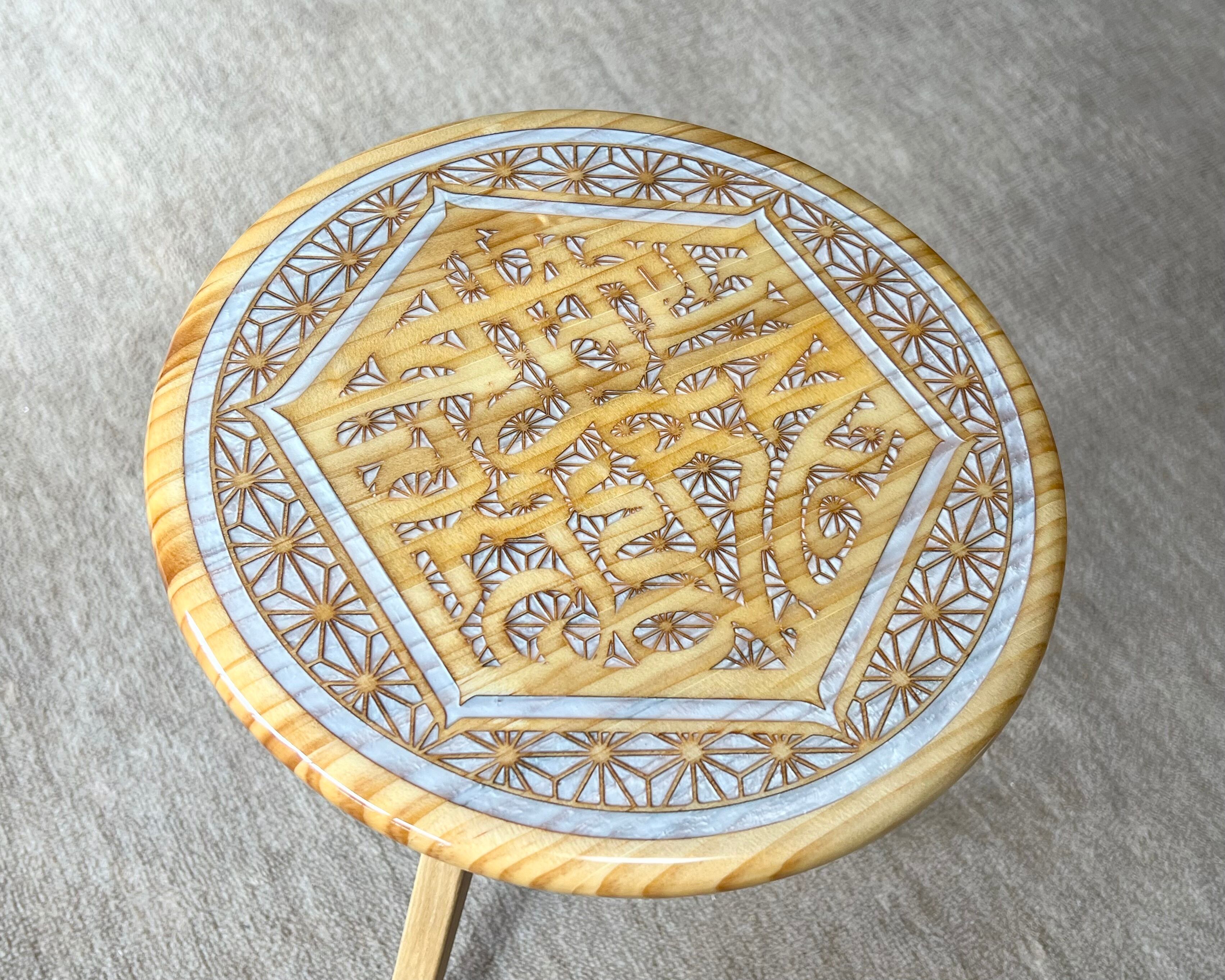 ・カメラ用の三脚に使用できるサイドテーブル用の天板になります。パイン集成材にオリジナルデザインを彫刻し、その彫刻箇所にレジンを流し込み、一度木目が出るまで研磨し、トップコートレジンを施工、研磨しております。UVプリンターやシルスクリーンには出せない木材との一体感が美しい天板です。素敵なライフスタイルに差し色としていかがでしょうか。